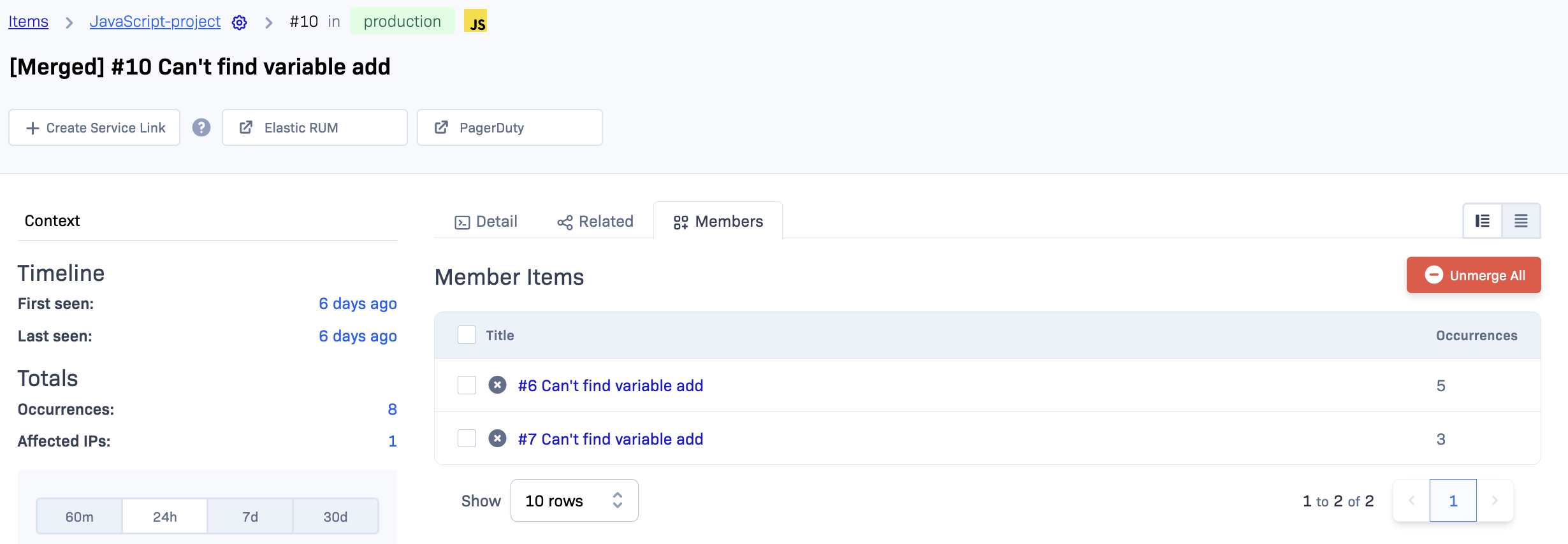 After you've merged to create a group item, all future occurrences with the same fingerprint as one of the member items will be included into the group. You may also want to merge similar items that will have different fingerprints into the same group (e.g. all TimeoutError exceptions regardless of where they occur).